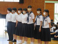 9月26日(火)の全校集会では、まず第18回南那珂地区中学校秋季体育大会での入賞の校納や授与が行われました。校納する賞状を校長先生に渡す際は、各主将が地区大会での健闘や県大会へ向けての意気込みについて述べていきました。