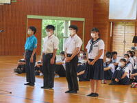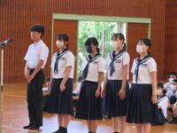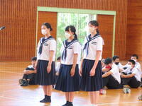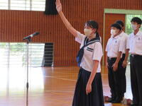 7月13日(木)の集会の時間に、県中学校総合体育大会及び県吹奏楽コンクール推戴式が行われました。各部の代表が大会・コンクールに向けた意気込みを発表しましたが、特に3年生にとっては最後の大会ということもあって、1つ1つの言葉に重みがありました。選手宣誓は弓道部主将が行い、選手・奏者一同、気が引き締まったことだと思います。宣誓の後は、吹奏楽部が演奏を披露。