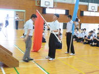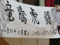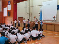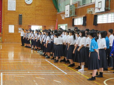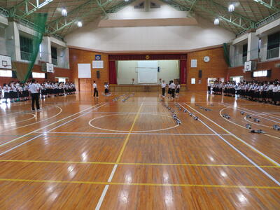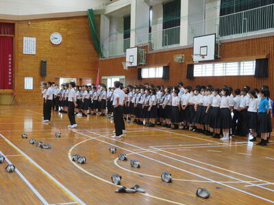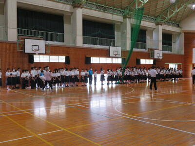 引き続き体育大会結団式が行われました。今年度のスローガンは「竜騰虎闘~南郷中の英雄よ この戦いを歴史に刻め~」。校長先生の話からは、すでに団長、副団長を中心に生徒たちが動き始めていることにも触れながら、大会当日だけではなく、そこに至るまでの準備・練習等にも積極的に取り組むことが大切であることを話されました。その後、団長対決による団色決定、団ごとの結団式、最後は両団による大迫力の校歌斉唱で競いました。スローガンにある通り、南郷中の歴史に刻めるような大会を、全員でつくっていきましょう。