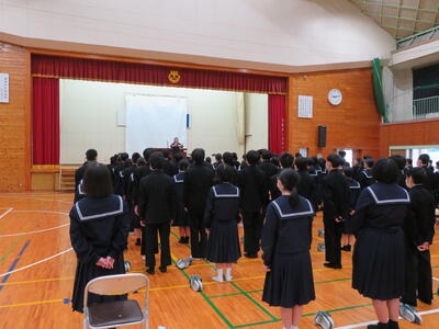 3月24日(金)は修了式が行われました。修了証授与の後、各学年の代表生徒が1年間の反省等を発表しました。発表内容は「先輩方からの支援を受けながら、積極的に行事に取り組めるようになったこと」、「行事に企画から携わっていくことで、今までにない達成感や満足感が得られたこと」、「生徒会活動の反省とこれからの生徒会に関すること」などでした。校長先生の話では、これまでを振り返り、各行事で「南郷中ならでは」の特色が生かされていたことについて触れた後、「協調(折り合いをつけること)」を身に付け、「自立」して自ら学校生活が楽しくなるよう努めることの大切さについて話されました。校歌斉唱は、1、2年だけの校歌となりましたが、素晴らしい歌唱でした。