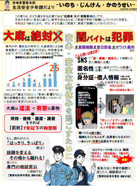 冬季休業期間中の非行防止・健全育成に向けた取組の一環として、宮崎県警察本部生活安全少年課から、下の文書が届いています。生徒が安心・安全な冬休みを過ごすことができるように、ぜひご覧いただき、ご家庭でもお子様にご指導ください。