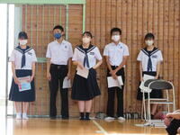地区中学校秋季体育大会が今週末に迫り、県大会に出場する水泳競技と合わせて推戴式がおこなわれました。まず、各部、クラブから大会にかける意気込み、これまで指導や応援をしてくださった方々への感謝の気持ちなどが述べられました。男子ソフトテニス部の主将が代表で宣誓し、選手一同、より気持ちが引き締まったことと思います。校長先生から激励の言葉が送られた後、全校生徒で校歌を歌いました。全員が心をひとつに一生懸命歌い、特に3年生の歌声からは、後輩たちを後押しする強い思いが感じられました。きっと選手たちにも伝わったことでしょう。