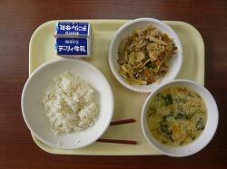 今日の給食は「まる麦ごはん、親子丼の具、小松菜のおかか和え」でした。今日もおいしくいただきました。ありがとうございます。