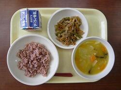今日の給食は11月24日の和食の日にちなんで日本の伝統食である赤飯で、「赤飯、ご汁、れんこんきんぴら」でした。今日もおいしくいただきました。ありがとうございます。