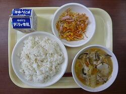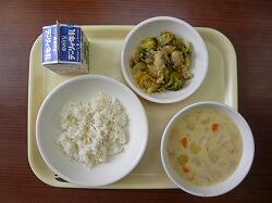 今日の給食は「麦ごはん、コーンチャウダー、鶏肉のカレー炒め」でした。今日もおいしくいただきました。ありがとうございます。