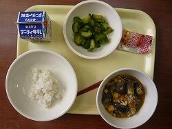 今日の給食は「まる麦ごはん、マーボーなす、たたききゅうり、りんごのスティックタルト」でした。今日もおいしくいただきました。ありがとうございます。
