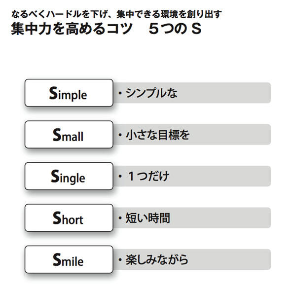 また、いろいろと調べていると、集中力を高めるコツとして5つのSというものがありました。それは、