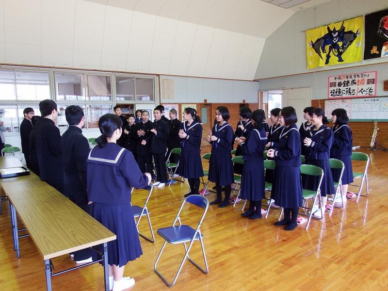 この1年間、学級活動の時間や補充の時間を利用して、全学年合同の学習を10回程度行いました。内容は、これからの生き方を考えたり、学校のよさに気づいたり、と盛りだくさんでした。限られた時間の中で、全校生徒26名は学年の枠を超えて真剣に取り組んでくれて、充実した学習となりました。最後の時間に、一人一人に自分の心の成長を書いてもらいました。時間いっぱいかけて書いている姿を見て、とても嬉しく思いました。この学習では、「よろこばせごっこ」をみんなでしていこう。そして自分を大切に思う気持ちをもち、そこから生まれた周りを大切に思える気持ちを広げていこう…をみんなの心で考えてきました。これからも自分を大事に、周りを大事に、たった一度しかない人生を悔いなく過ごしていってください。