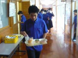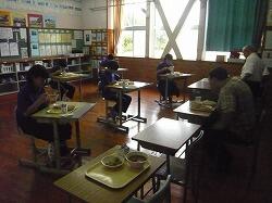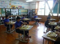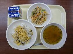 今日の給食は「まる麦ごはん、鶏飯の具、鶏飯のスープ、ごぼうサラダ」でした。今日もおいしくいただきました。ありがとうございます。