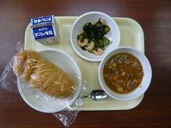 今日の給食は「ミルクパン、牛肉とひよこ豆の洋風煮込み、エビとわかめのサラダ」でした。今日もおいしくいただきました。ありがとうございます。