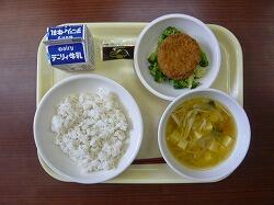 今日の給食は「麦ごはん、かぼちゃのみそ汁、彩り野菜とキャベツのメンチカツ、ブロッコリー、減塩中濃ソース」でした。今日もおいしくいただきました。ありがとうございます。
