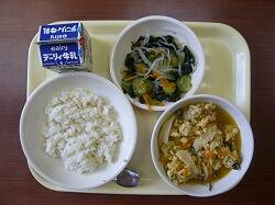 今日の給食は「麦ごはん、高野豆腐のそぼろ煮、小松菜の辛子マヨネーズ和え」でした。今日もおいしくいただきました。ありがとうございます。