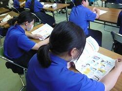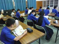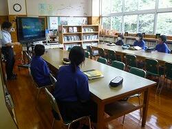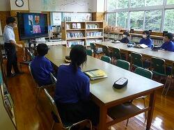 1年生は教室の電子黒板の調子が悪く、図書室で英語の学習をしました。
