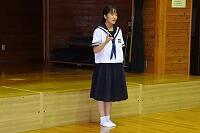 県中体連秋季体育大会の選手推戴式が行われました。本校からは、バドミントン女子シングルスに、先の地区大会で2位となった山口依智子さんが出場します。全校生徒がエールを送って激励しました。