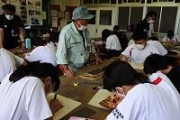 宮崎県技能士会連合会より講師を派遣していただき、銅板を使ったネームプレートづくりに挑戦しました。作業は自分の名字を銅板に転写することから始まり、10近くの工程を経て立派な作品が仕上がりました。