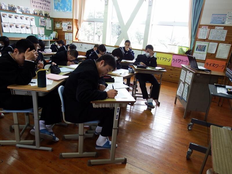 この1年間、学級活動の時間や補充の時間を利用して、全学年合同の学習を10回程度行いました。内容は、これからの生き方を考えたり、学校のよさに気づいたり、と盛りだくさんでした。限られた時間の中で、全校生徒26名は学年の枠を超えて真剣に取り組んでくれて、充実した学習となりました。最後の時間に、一人一人に自分の心の成長を書いてもらいました。時間いっぱいかけて書いている姿を見て、とても嬉しく思いました。この学習では、「よろこばせごっこ」をみんなでしていこう。そして自分を大切に思う気持ちをもち、そこから生まれた周りを大切に思える気持ちを広げていこう…をみんなの心で考えてきました。これからも自分を大事に、周りを大事に、たった一度しかない人生を悔いなく過ごしていってください。