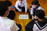今年度の生徒会役員による最後の生徒集会では、ネット依存について考えました。まず、生徒一人一人が、”榎原版ネット依存予備軍診断アンケート”を行いました。次に、4つのグループに分かれて、”ネットすごろく”を行いました。出た目の数だけ進んだところに書かれてあるネットトラブルに対して、自分はどのように対処するかを述べ合うゲームでした。最後に、榎原中のネット利用3ヶ条を生徒全員で読み上げました。