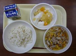今日の給食は「減量麦ごはん、コーンラーメン、フルーツ杏仁豆腐」でした。今日もおいしくいただきました。ありがとうございます。