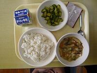 今日の給食は「減量麦ごはん、五目うどん、きゅうりとささみの梅肉和え」でした。