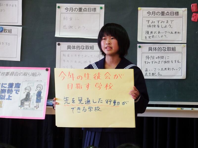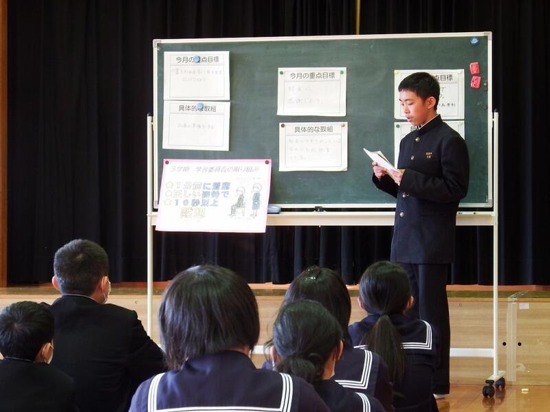 1月11日(水)、今月の生徒集会がありました。先月が生徒会役員引継ぎだったので、今回が新役員の初集会となりました。緊張の中、しっかりそれぞれの役目を果たしていて、さすがだと思いました。新生徒会長から、「今年の生徒会が目指す学校」として、①先を見通した行動ができる学校 ②しっかりコミュニケーションが取れる学校 ③相手の気持ちを考え、思いやることができる学校 の3つが提案され、みんなでさらにすばらしい榎原中にしていこうというムードが生まれました。これからが楽しみですね。