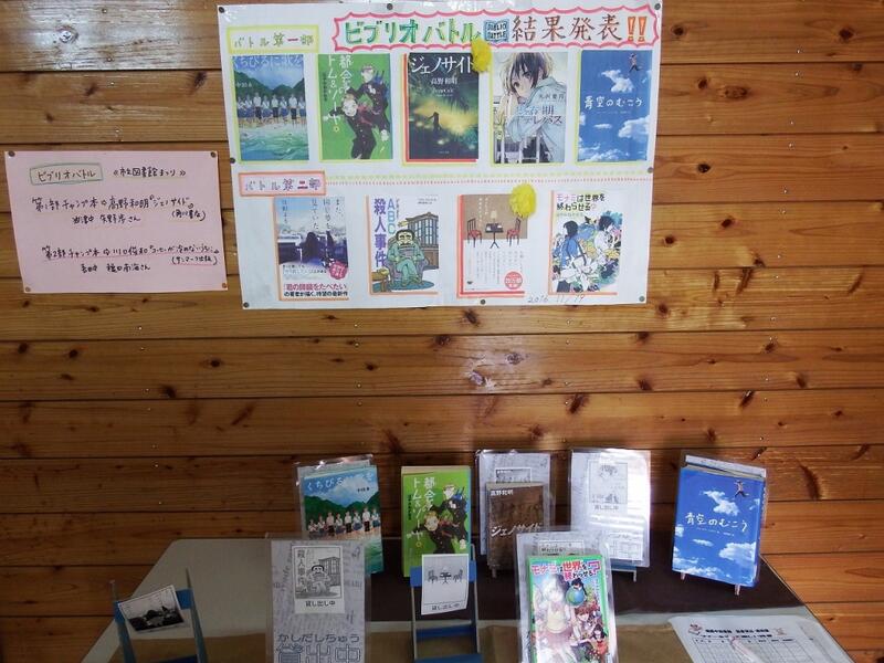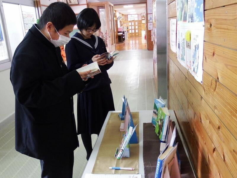 教室前廊下に数冊の本が置いてあります。これは、11月の日南市図書館まつりで行われたビブリオバトルで紹介された本です。通常では本の貸出は図書室でするのですが、これらの本に関しては、この机にある貸出簿に自分たちで書いて借りるようになっています。すでに何冊かの本が借用中となっていました。こうして自主的に本に親しむ習慣、とてもすばらしいですね。