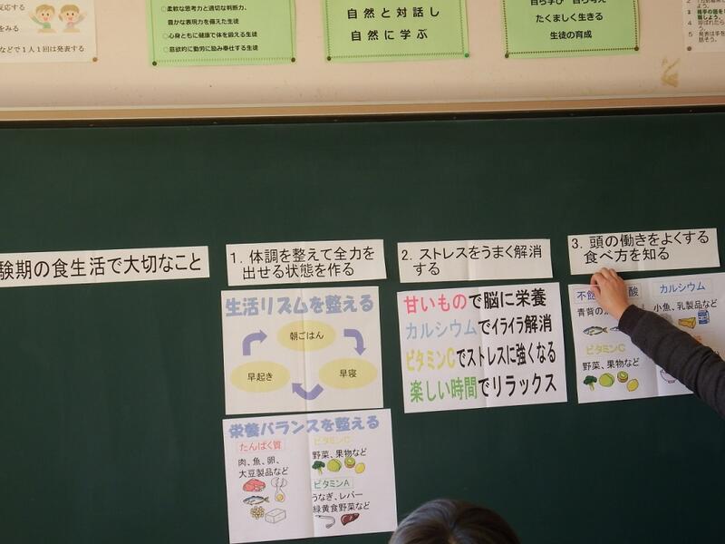 今年度は、南郷小の栄養職員の方が学期1回来校されて、学年ごとに給食中、食に関するミニ講話をいただいています。今回は3年生ということもあって、テーマは「受験期の食生活で大切なこと」。①体調を整えて全力を出せる状態をつくる ②ストレスをうまく解消する ③頭を働きをよくする食べ方を知る の3つをアドバイスいただきました。私立入試まであと3日。心身ともにベストコンディションで!