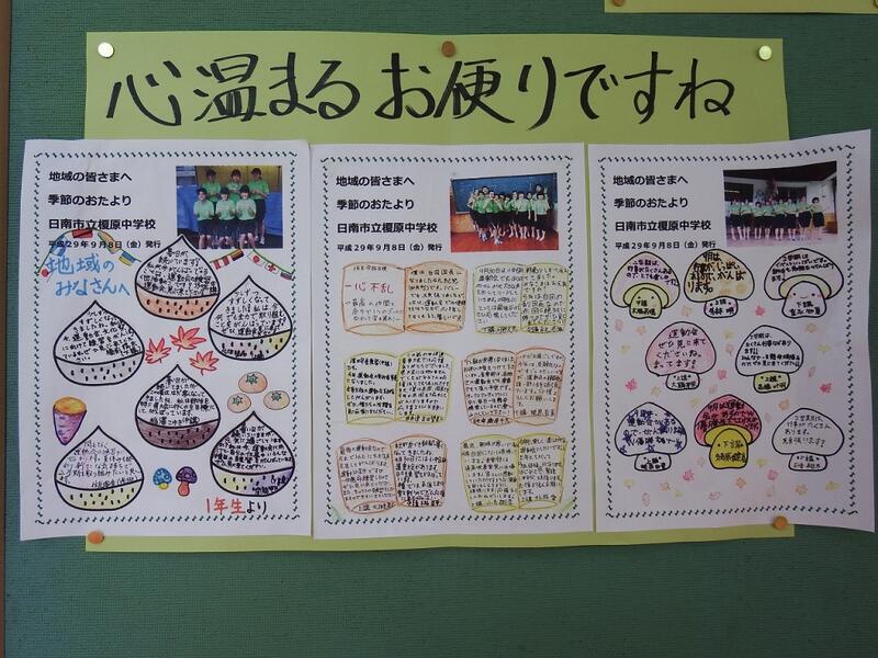 毎月1回のペースで、学校便りなどを自治会長さんの御協力で、地区の回覧板に入れていただいています。今月は先日全校生徒が作成した「敬老新聞」をお届けしました。どれもとても温かいメッセージが書かれていて、心がほっかりしました。回覧板で地区の方々に笑顔がいっぱい広がりますように…。