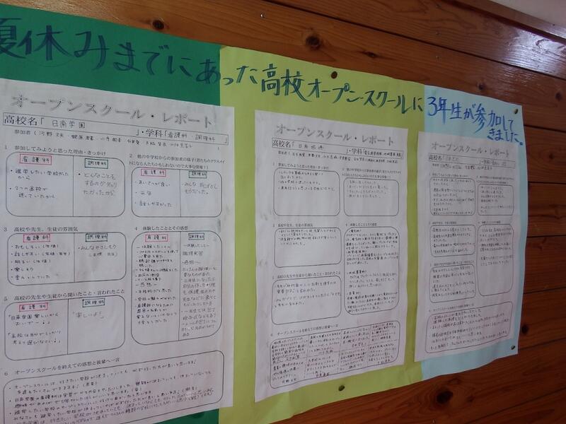 3年生が夏休み中に高校のオープンスクールにいった感想や学びが、3年生教室前廊下に掲示されています。毎日忙しい中で、3年生はあと3か月までに最終進路決定をしなくてはなりません。次のステップ、そしてその次のステップ…と、自分の人生のゴールイメージをしっかりもっておくことはとても大事です。この掲示を見て、1・2年生も人生についてイメージを深めてもらえると嬉しいですね。