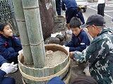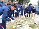 生徒は、少々手元はおぼつかなかったものの、竹割りしたり荒縄を張ったりするなどの作業に一生懸命取り組みました。約1時間後、立派な門松が完成しました。榎原中学校もよいお正月が迎えられそうです。