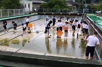 全校生徒と職員が小学校に総出して、プール清掃を行いました。本校にはプールがないため、小学校のプールを借りて水泳の授業を行っているからです。天気を心配していましたが、雨に降られることもなく無事に終了することができました。プール開きは6月15日の予定です。