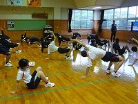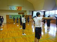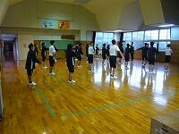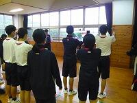 1時間目は全校生徒一斉の体育の時間でした。まずはラジオ体操です。映像を見ながら動きを確認しています。今はあまりやらないようでうまく体を動かせないようです。