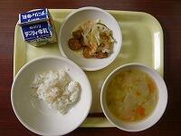 今日の給食は「麦ごはん、豚汁、がね、やみつきキャベツ」でした。