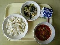 今日の給食は「麦ごはん、鶏肉のトマト煮、海藻サラダ」でした。今日もたくさん食べました。