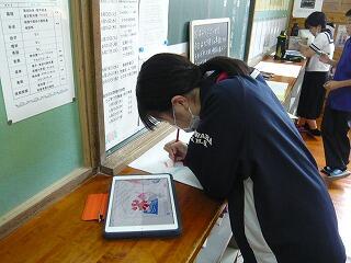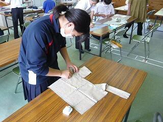家庭科の授業で「エコバッグ」を作っていました。なかなか上手です。次の時間あたりにミシンを使うのかな?