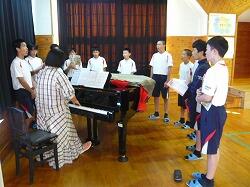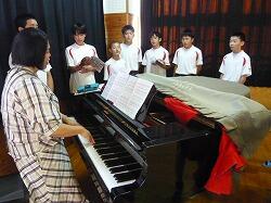 放課後は多目的室でパート別に合唱練習をしました。教頭先生のピアノとCDを使って練習です。非常にいい声です。