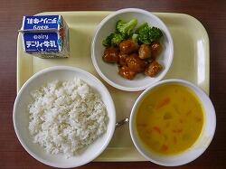 今日の給食は「麦ごはん、パンプキンチャウダー、ミートボールのケチャップ煮、ブロッコリー」でした。今日もおいしくいただきました。ありがとうございます。