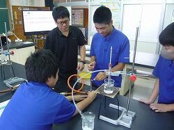 1年生は理科の実験をしています。ガスバーナーにうまく火がつけられるか?