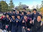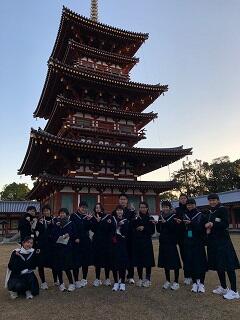薬師寺を見学して、今からホテルに向かいます。全員でユネスコ世界遺産のお寺でパチリ。 *画像は加工しています。