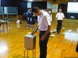 6校時目に全校生徒で選挙について、日南市選挙管理委員会の田中委員長、重永事務局長、白坂事務局次長3名の方々に説明をしていただきました。