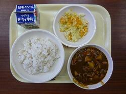 今日の給食は「まる麦ごはん、ビーンズカレー、コールスローサラダ」でした。今日もおいしくいただきました。ありがとうございます。
