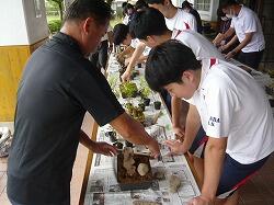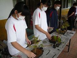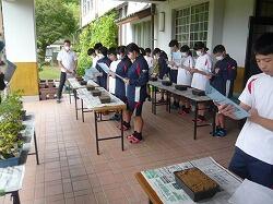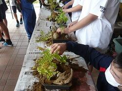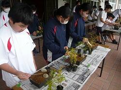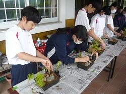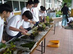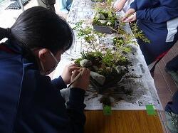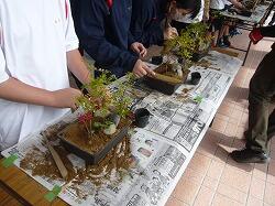 3,4校時目に宮崎県技能士連合会事務局、宮崎県造園緑地協会日南支部の方をお招きして「ミニ造景作り」に挑戦しました。