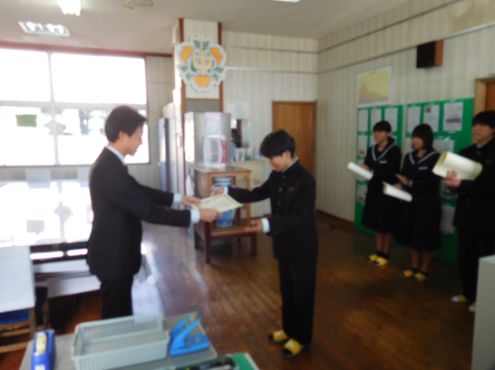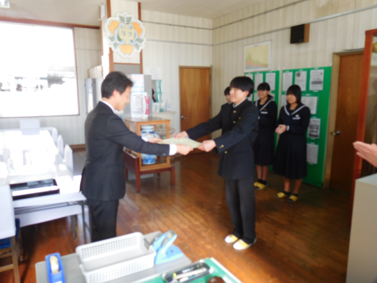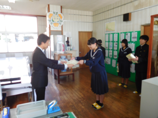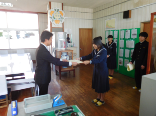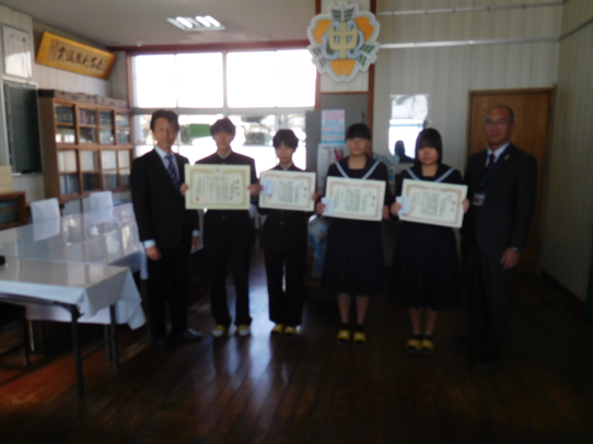 12月12日(金)の昼休みに、都城税務署長および職員の方が本校に来校され、「税に関する作文」の表彰式が校長室にて行われました。