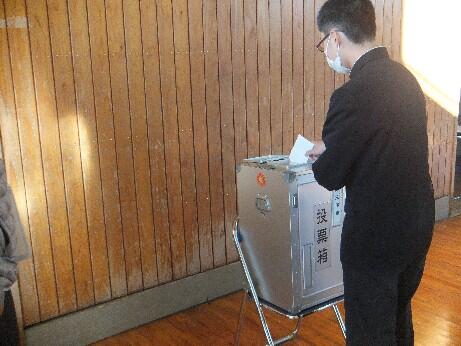 投票は、学年別に体育館で実施しました。投票箱と記載台は、実際の選挙に使用されるものを借りてきて行われたので、緊張感が漂う中での投票でした。