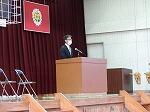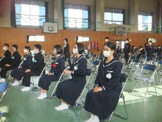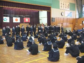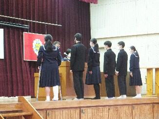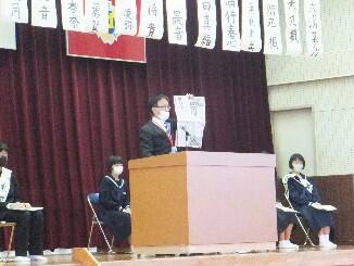 都城市民憲章朗読(前文朗読 3の3甲斐愛梨さん)と生徒信条(前文朗読 3の2岩田凌弥さん)を行い、各学年の代表生徒(1の2吉川季希さん、2の3佐々木鴻子さん、3の1原田蓮さん)による2学期の反省がありました。生徒たちは、2学期を振り返り、今年度最後の3学期への抱負を堂々と発表してくれました。