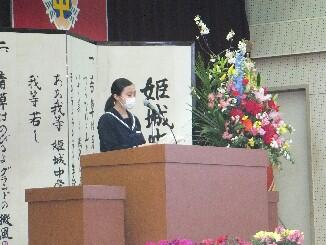 都城市民憲章朗読(前文朗読 2の3佐藤杷奈香さん)と生徒信条(前文朗読 2の1楠見瑠璃さん)を行い、各学年の代表生徒(1の1福丸銀次朗さん、2の1楠見瑠璃さん、3の2花牟禮愛華さん)による新年の抱負を堂々と発表してくれました。