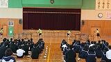 体育館の入場の仕方や整列の仕方、礼法について、3年生を模範にして確認しました。その後、給食の準備やマナーについて、全校給食委員長、副委員長が説明しました。