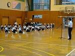 体育館(2・3年生)と1年生の各教室をリモートでつないで行いました。