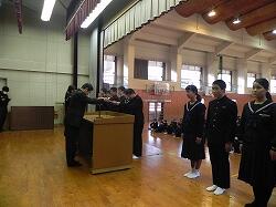 から新生徒会長へ校旗引継が行われました。新生徒会の活躍を期待をして