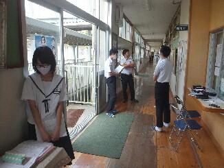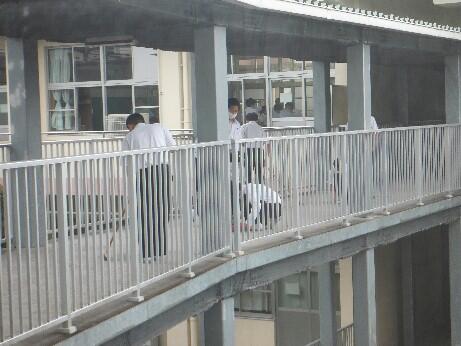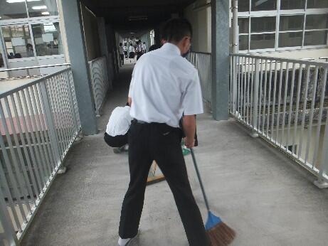 6月3日(水)、昼休み、約10名の2年生が自主的に2階渡り廊下を職員と一緒に清掃していました。コロナウイルスのため、普段の生活が送れない毎日ですが、何だか「ほっ」とする光景でした。ありがとうございました。(教頭:鎌田浩二)