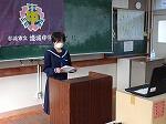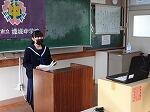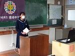 都城市民憲章朗読(前文朗読 3の1佐藤把奈香さん)と生徒信条(前文朗読 3の1楠見瑠璃さん)を行い、各学年の代表生徒(1の2中川侑愛乃さん、2の2遠武梨花さん、3の3山内魅音さん)による2学期の反省がありました。生徒たちは、2学期を振り返り、今年度最後の3学期への抱負を堂々と発表してくれました。